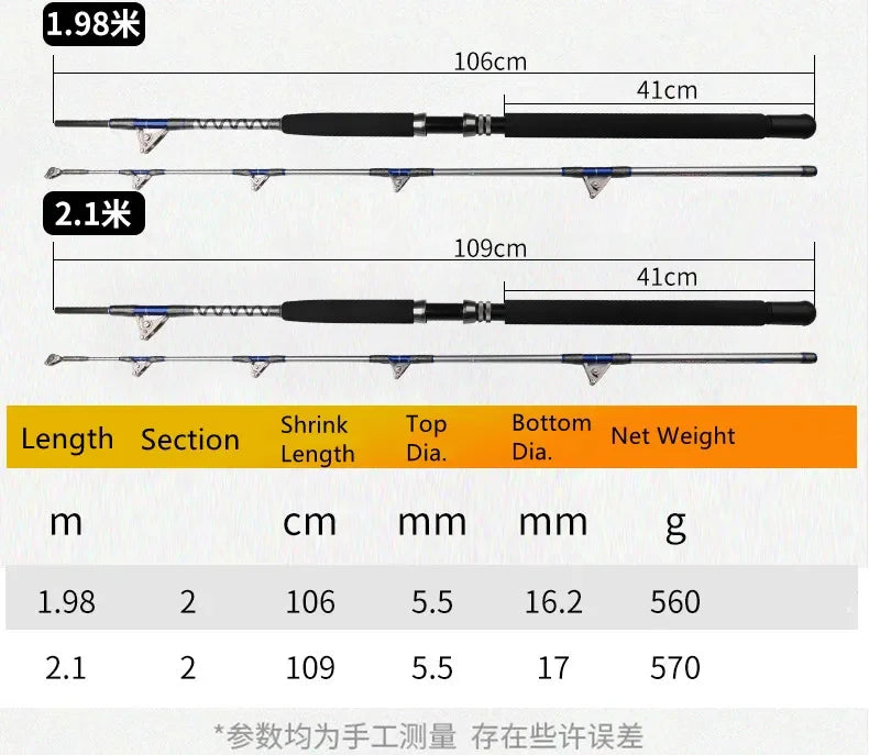 Length : 1.98M,2.1M | Closed Length: 106cm,109cm | Spinning Rod | 2 Sections | Lure W : 200-800g |  Weight(about): 560g,570g | Suitable: iron plate, much more attack fish| Hardness: XXH