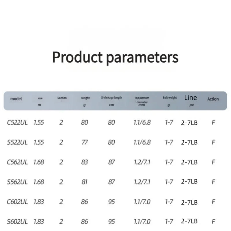 Type: Casting | Length: 1.5m | Closed Length: 0.80m |Weight: 77g | Section: 2 | Top Diameter: 1.1mm | Bottom Diameter: 6.8mm | Lure Weight: 1-7g /Line Weight: 2-7lb