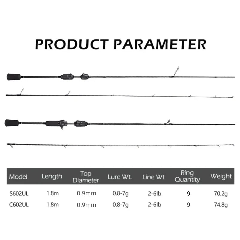 Length: 1.8m | Closed Length: 48cm |Weight: 70.2g | Section: 4 | Top Diameter: 0.9mm | Lure Weight: 0.8-7g